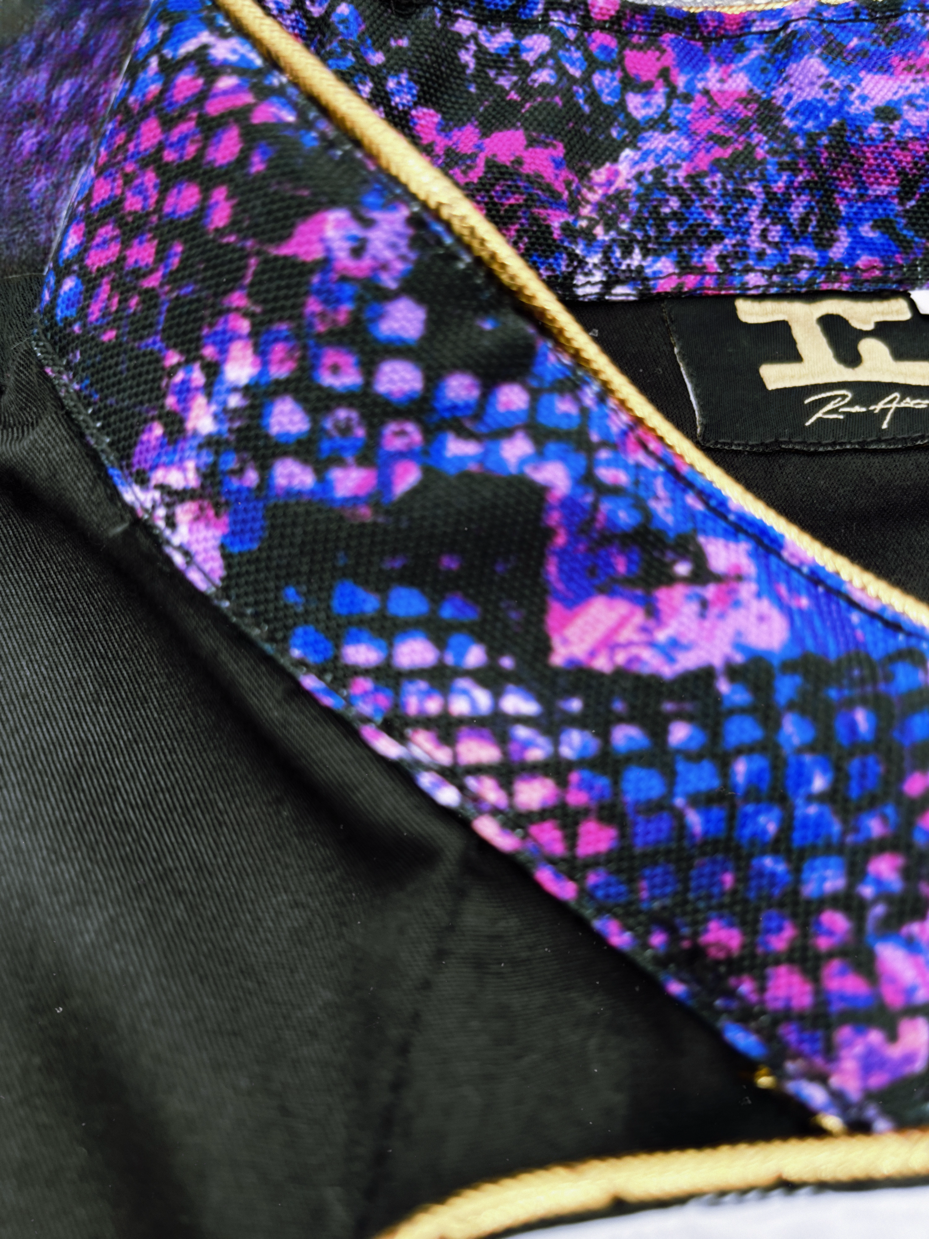 - Purple snakeskin printed fabric with striking gold accents for a look that’s as fierce as it is stylish.